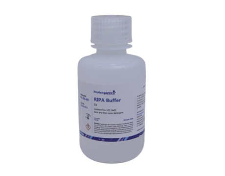 Proteogenixx’s RIPA (Radioimmunoprecipitation Assay) Buffer is a high-quality, ready-to-use reagent designed for effective cell lysis and protein extraction from mammalian cells.It offers excellent performance at an affordable cost, eliminating the need for additional preparation.